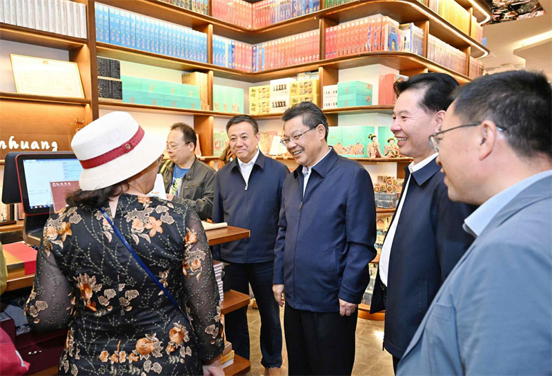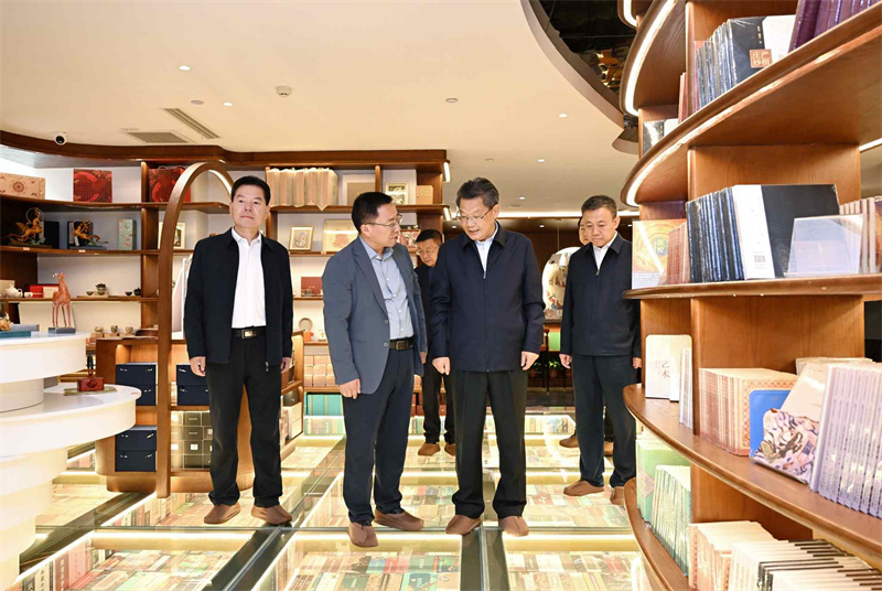 任振鶴先后來到敦煌印局、敦煌無界、敦煌書局和敦煌集·非遺文化街區(qū),詳細了解文化產業(yè)發(fā)展和非遺文化街區(qū)建設等情況。他指出,敦煌文化延續(xù)近兩千年,是世界現(xiàn)存規(guī)模最大、延續(xù)時間最長、內容最豐富、保存最完整的藝術寶庫。要不斷擦亮敦煌文化名片,圍繞建設世界文化遺產保護的典范和敦煌學研究高地,把握傳承和創(chuàng)新的關系,找準契合處、聯(lián)結點,加快業(yè)態(tài)融合、產品融合、市場融合、服務融合,在更高起點、更高層次、更高目標上讓敦煌文化“活起來”“潮起來”,為現(xiàn)代化建設提供有力文化支撐。