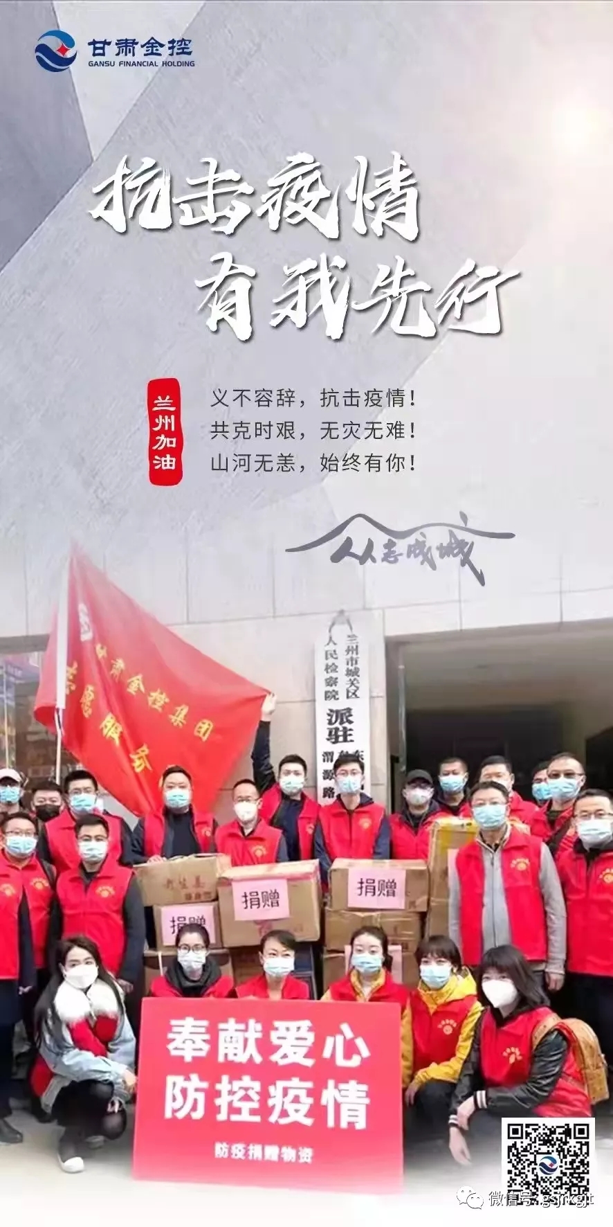 十月的金城,還沒來得及走出國慶的喜悅,突襲而至的“德爾塔”病毒讓整個城市按下了“暫停鍵”,車水馬龍的蘭州市顯得格外靜寂,美麗的黃河之濱也略失姿色,唯有滿城鮮紅的黨旗給人以信念,白衣鎧甲的逆行者給人以信心,“蘭州加油、抗疫必勝”的強音不斷響徹金城大地。十月“抗疫之戰(zhàn)”打響以來,全省各行各業(yè)主動扛起責任,醫(yī)護人員晝夜奮戰(zhàn)、公安民警奮勇當先,國企勇挑重擔,民企積極出力,科研人員奮力攻關(guān),黨員干部投身志愿一線,全城的每一個人都在竭盡全力為抗疫貢獻自己的一份力量,共同描繪著一幅同舟共濟的抗疫畫卷。隴原融資租賃公司就是這其中的一支隊伍,在甘肅金控集團黨委的堅強領(lǐng)導(dǎo)下,全體員工積極服從疫情防控大局需要,全力夯實金融支持疫情防控堅強后盾,主動投身疫情防控的嚴峻斗爭中。